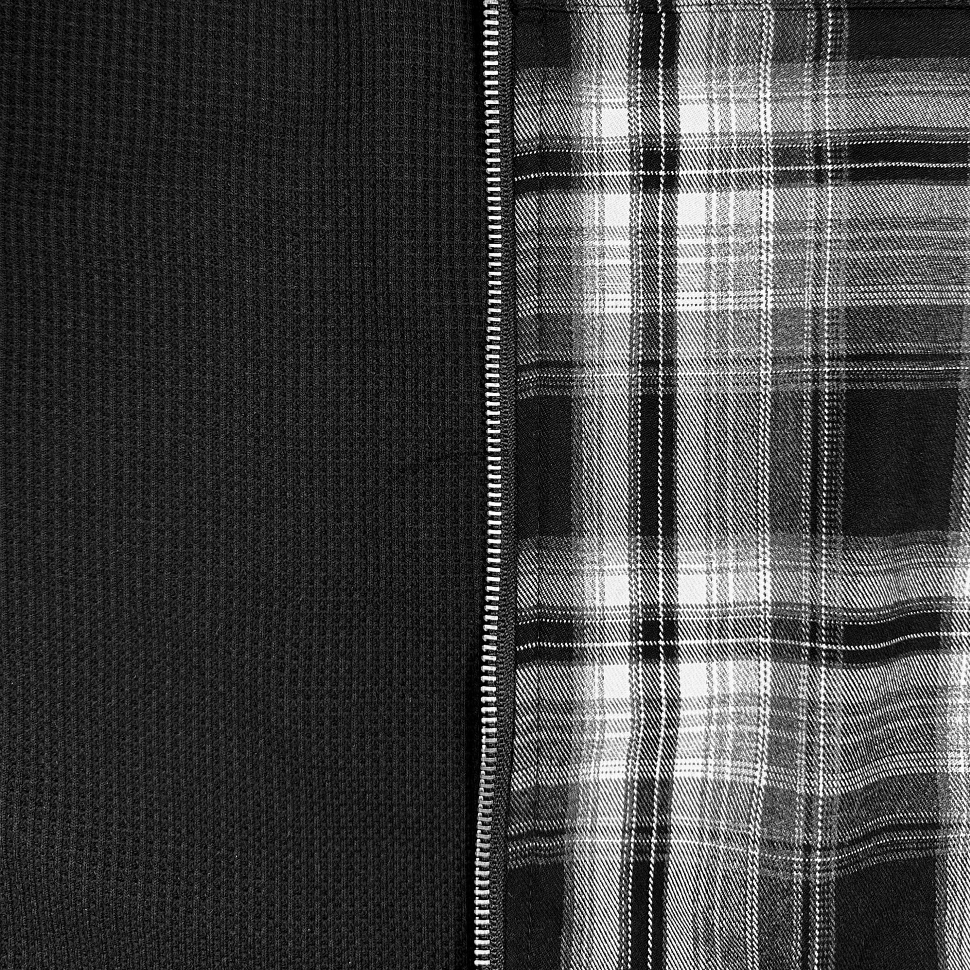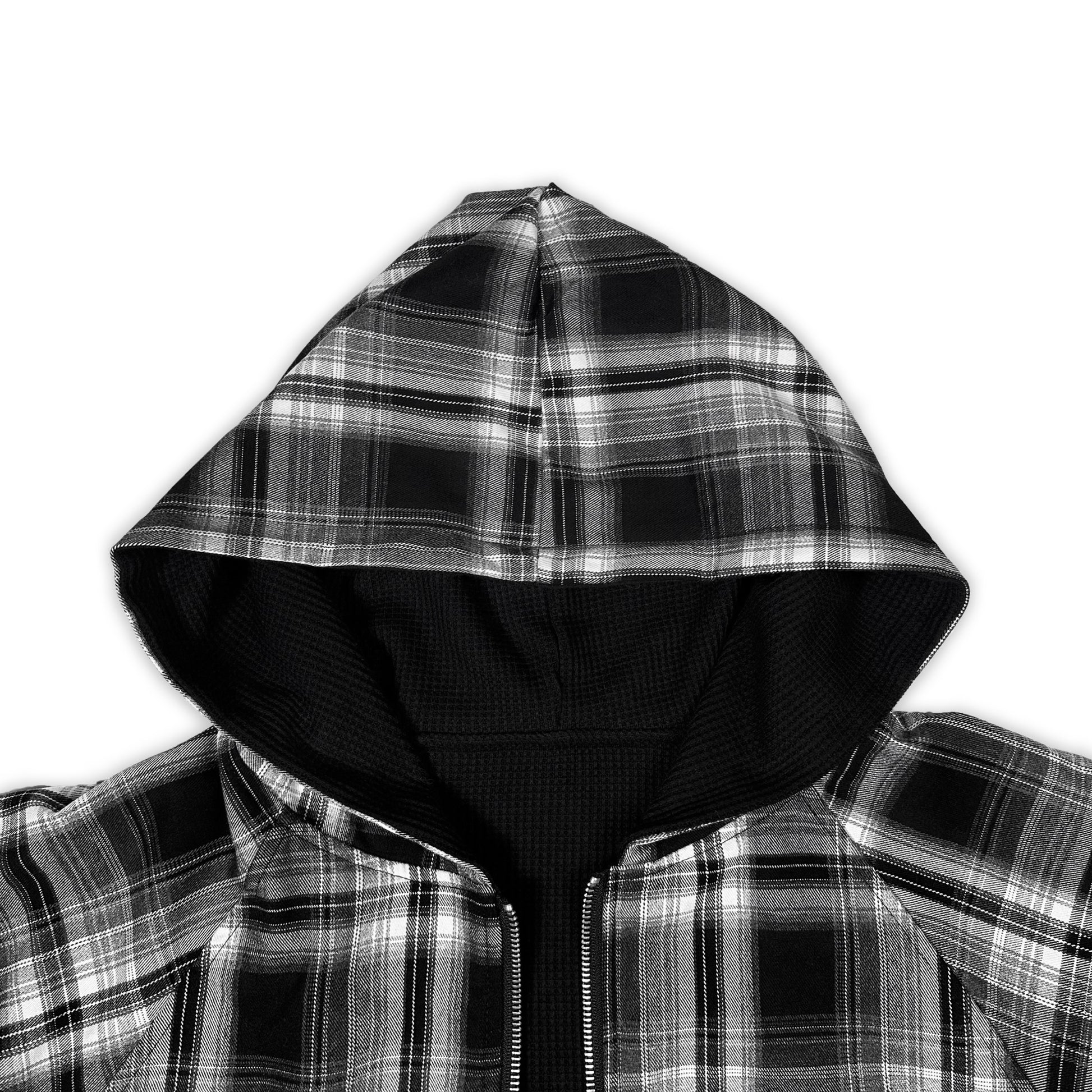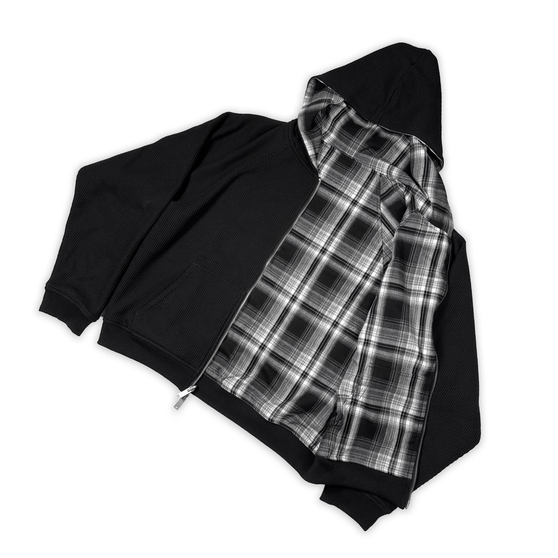 Fully reversible design — Waffle-knit on one side, plaid flannel on the other. All hoodies are pre-made