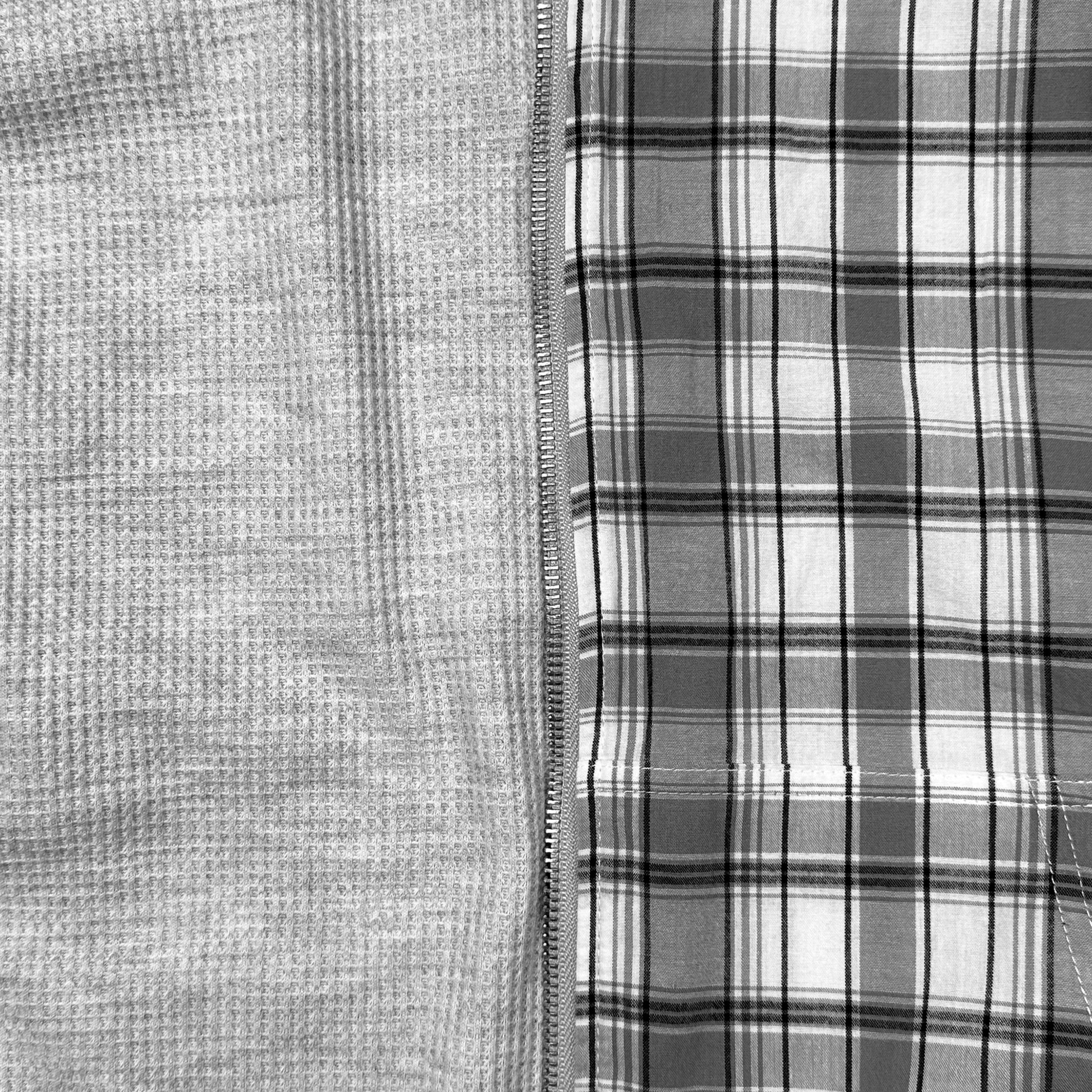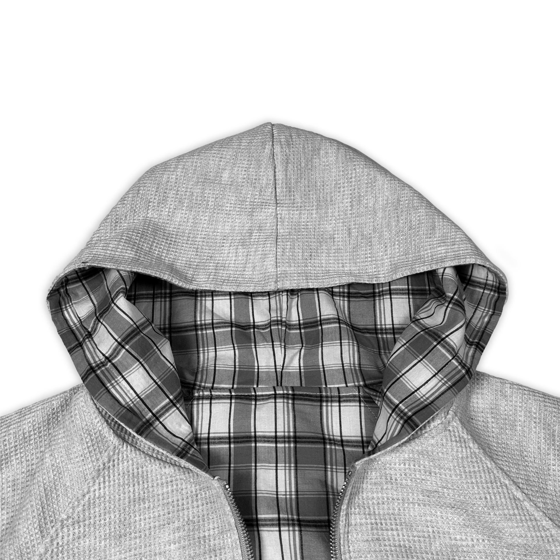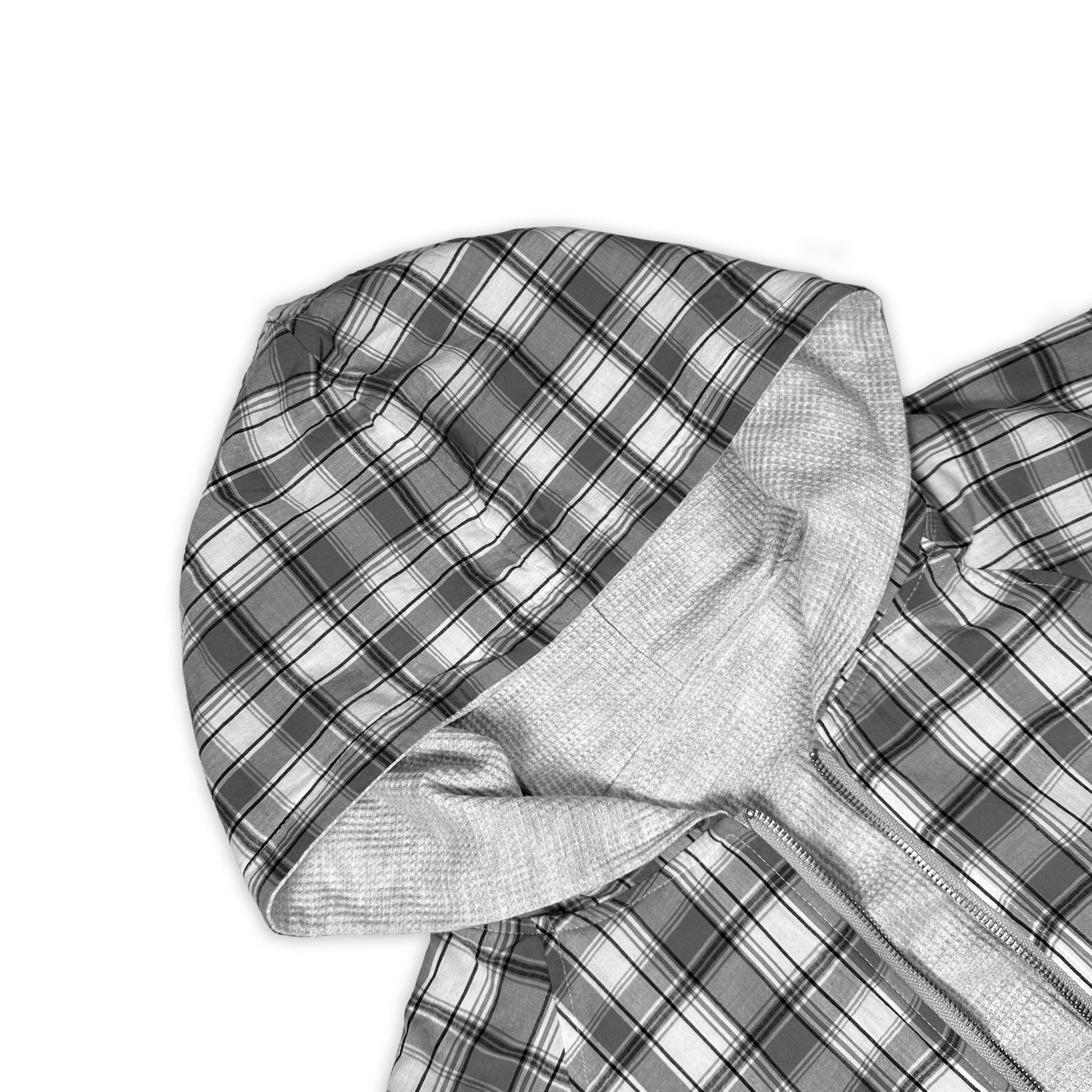 Fully reversible design — Waffle-knit on one side, plaid flannel on the other. All hoodies are pre-made